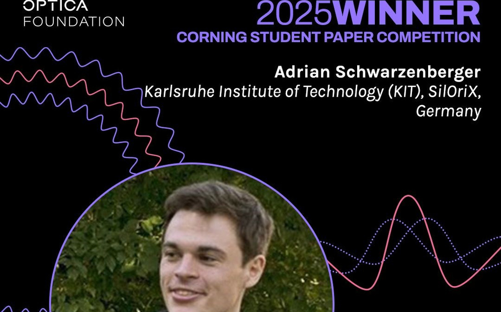 The paper, "Silicon-Organic Hybrid (SOH) Mach-Zehnder Modulator (MZM) for Single-Carrier IMDD Line Rates of 500 Gbit/s and Beyond", written by Adrian Schwarzenberger, PhD candidate at IPQ, received the Corning Outstanding Paper Award at the 50th Optical Fiber Communication Conference.