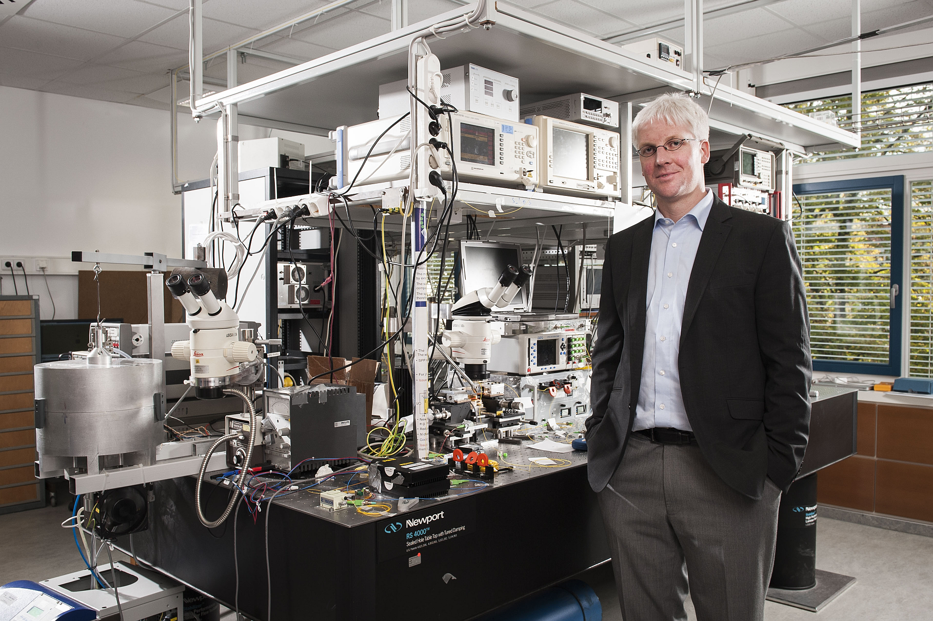 October, 2014: Prof. Dr. Christian Koos received State Research Award (Landesforschungspreis) 2014 for applied research. In their joint experiment, the researchers of IPQ and the EPFL (Ecole Polytechnique Federale de Lausanne) have demonstrated that integrated optical frequency comb sources with large line spacings can be realized on photonic chips and applied for the transmission of large data volumes. They reached a data rate of 1.44 terabits per second: This corresponds to a data volume of more than 100 million telephone calls.